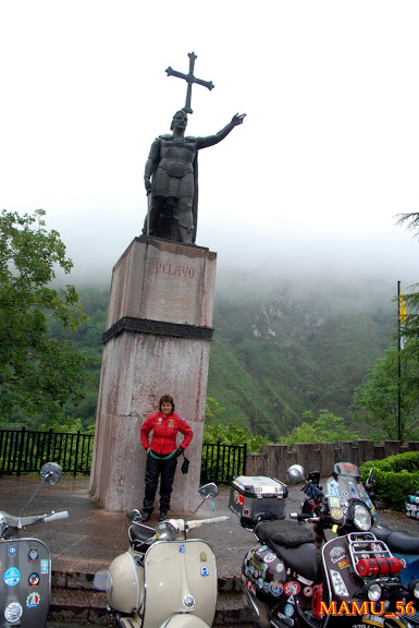 Luego subimos a la tradicional y ya costumbre arraigada de bendecir nuestras monturas en la explanada de la basílica por el capellán, la no menos costumbre de hacerme una foto con Don Pelayo el cual es pieza fundamental de lo que hoy es España y que fue primer monarca del reino de Asturias y frenó la expansión de los musulmanes hacia el norte, comenzó la Reconquista y se le ha considerado tradicionalmente como el fundador del Reino de Asturias.