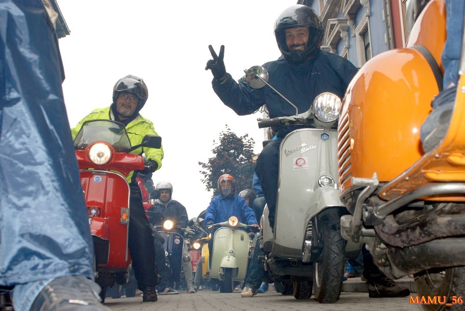 La subida a Lagos de este año ha sido totalmente diferente a la que otros años hicimos con sol radiante , cielos azules y vacas tumbadas a la sombra de cualquier curva del sinuoso recorrido hacia los lagos con tramos para el vértigo y pendientes que quieren ser verticales, este año todo esto se sentía por que al dejar atrás el santuario empezó una espesa niebla que no te dejaba ver más allá de tus narices y la visera del casco con gotas como lagrimas al recordar, el chirimiri era constante y las Vespas y Lambretta nos estirábamos para coger esa seguridad que la distancia da, a mi particularmente estas inclemencias del tiempo me gustan (soy raro ) ¡¡lo se¡¡, te dan un plus de emoción y aventura, estaba disfrutando de algo que en anteriores subidas no tuve y esta la quería saborear diferente, como un buen bouquet, a tras el mirador de la Reina lo dejamos envuelto en brumas y silencios rotos por el petardear de las vespas y Lambrettas, es uno de los puntos más visitados de esta subida pero que este año no podremos plasmar las increíbles vistas que desde el se ven, seguimos subiendo prácticamente a tientas, esperando que ninguna de sus habitantes vacunas estuvieran dándose un paseo por la carretera o simplemente tumbadas a la bartola porque sería un problema grande habida cuenta de la escasa visibilidad reinante, intuyo que el lago Enol a 1070 metros de altitud está a la derecha y lo sé por la curva a izquierda que conozco después de una subida y seguida de bajada pronunciada, un poco más adelante nos paran la organización para el control de subida y comenzar la ascensión hasta el Lago Ercina donde en el pequeño bar que existe tomaríamos un pequeño tente en pie que nos vino de rechupete por que a estas altura de la mañana ya el estomago pedía algo para trabajar y como la densa lluvia no dejaba dar una vuelta por los alrededores nos sentamos y pasamos un ratito conversando con el amigo Juan e Isabel su señora esposa, Mayor, Isabelita y un servidor con un platito de chorizo, queso y morcilla negra y un trozo de buen pan con su correspondiente cervecita.